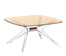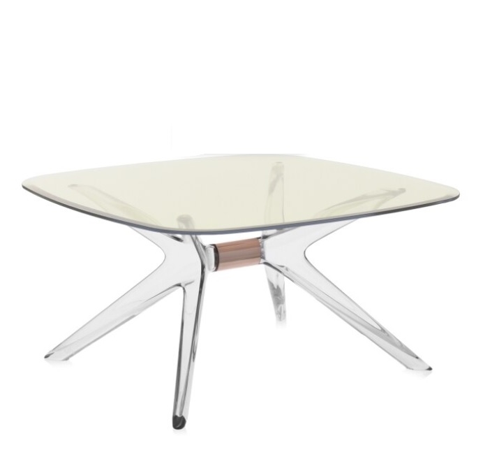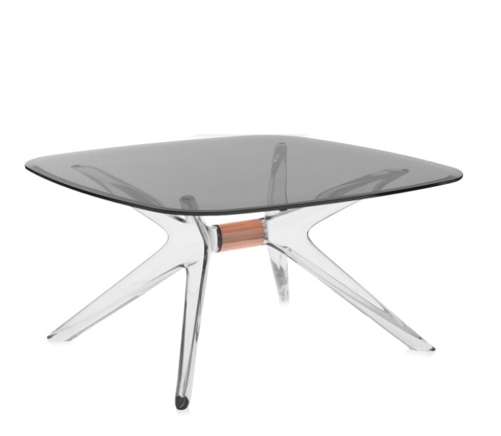 Blast bordet er et sidebord (fås i firkantede eller rektangulære versioner med afrundede hjørner) med gennemsigtig base og toppe. Derudover kan man vælge om man ønser bronze eller krom på bordbenene.
