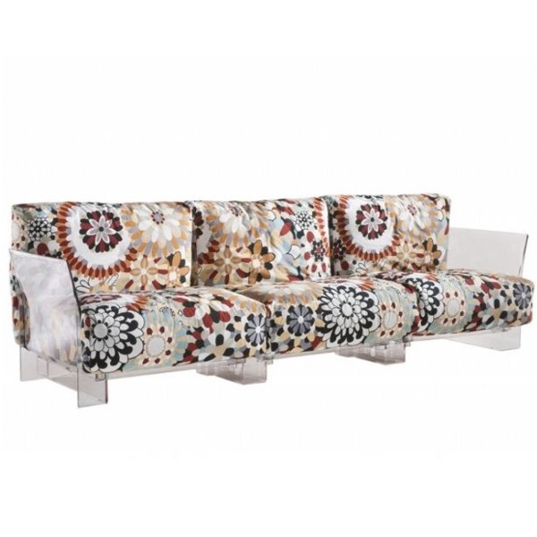Pop genopfinder den klassiske komfortable sofa med et frisk og let look. Samtidig er Pop den første sofa, som kan forlænges i det uendelige, og som kan skilles let ad. Det er opbygget af identiske transparente eller højglans sorte moduler af polycarbonat, som kan gentages og kombineres til den ønskede længde. Store og bløde puder dækker den lette ramme, og garanterer en fantastisk komfort, mens de skaber en iøjnefaldende kontrastvirkning sammen med det gennemsigtige eller sorte stel. Hynderne findes nu med mange typer betræk. Her ses den med Missoni betræk.